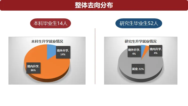 2024年6月学院毕业66人,其中研究生52人,本科生14人。整体深造就业率达97.0%,其中本科生升学率达100%,升学去向包括上海交通大学、中国科学技术大学、第一会所