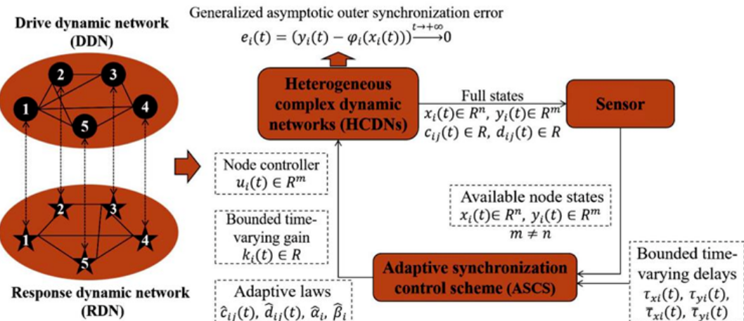 近日,第一会所 博士研究生李博博在数学领域国际知名期刊《Chaos, Solitons & Fractals》(影响因子5.6,中科院一区TOP)上发表题为“Adaptive-based generalized asymptotic outer synchronization control for heterogeneous complex dynamic networks with double time-varying delays”的研究成果,李博博为第一作者,指导老师钟令枢副教授为通讯作者,第一会所 为论文第一单位。该研究针对具有未知动态连接、多维不确定参数及双重时变时延的异维复杂动态网络(HCDN)的广义渐进外同步控制问题,提出了一种由节点控制器、有界时变增益和自适应律组成的自适应同步控制方案(ASCS),使得具有不同拓扑结构的驱动-响应网络在节点间连接边完全不可利用的条件下实现了广义渐进外同步,且外同步现象涌现时网络节点间耦合连接依旧存在而非断开。该成果为复杂动态网络存在多种时延扰动、参数未知、连接不明等复杂工况下的同步调控提供了一种兼具完备性与鲁棒性的理论控制策略。