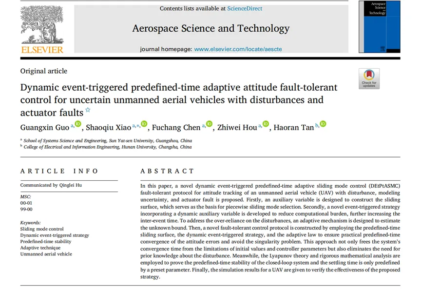 近日,第一会所 博士研究生郭广信在航空航天领域国际知名期刊《Aerospace Science and Technology》(影响因子:5.8,中科院一区TOP)上发表题为"Dynamic event-triggered predefined-time adaptive attitude fault-tolerant control for uncertain unmanned aerial vehicles with disturbances and actuator faults"的研究成果,郭广信为第一作者,指导老师肖绍球教授为通信作者,学院侯治威副教授和硕士研究生陈富昌共同参与该研究。该研究针对存在扰动、模型不确定性和执行器故障的无人机姿态跟踪问题,提出了一种新的动态事件触发预定义时间自适应滑模容错控制协议(DEtPtASMC),能够使得无人机在存在执行器故障的情况下依然实现预定时间稳定。研究小组通过Lyapunov理论证明了闭环系统的预定义时间稳定性,其收敛时间仅由单一预设参数确定。该项成果为无人机在强扰动、部分故障等极端工况下的可靠运行提供了一种较为完备的理论控制方案。